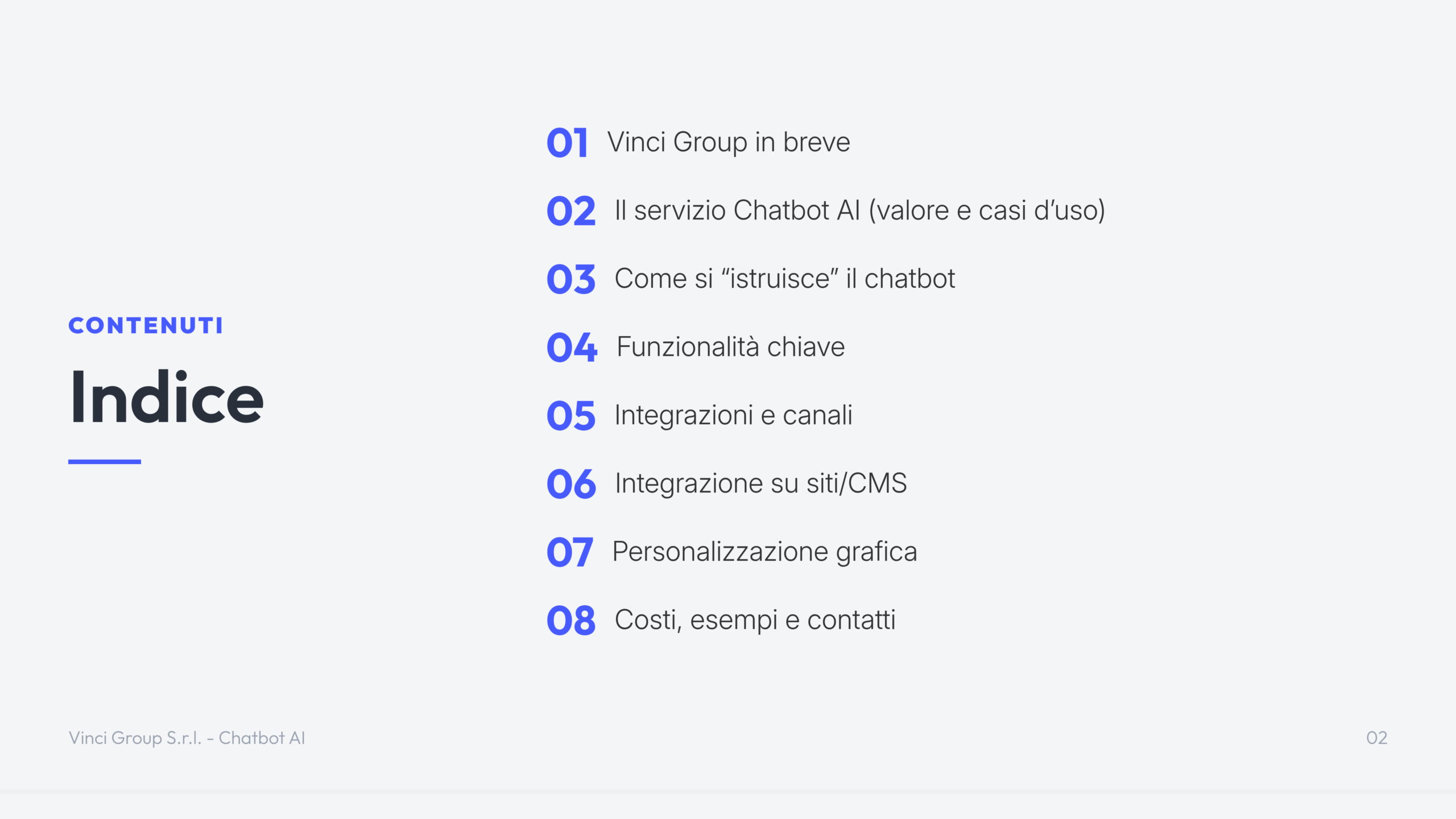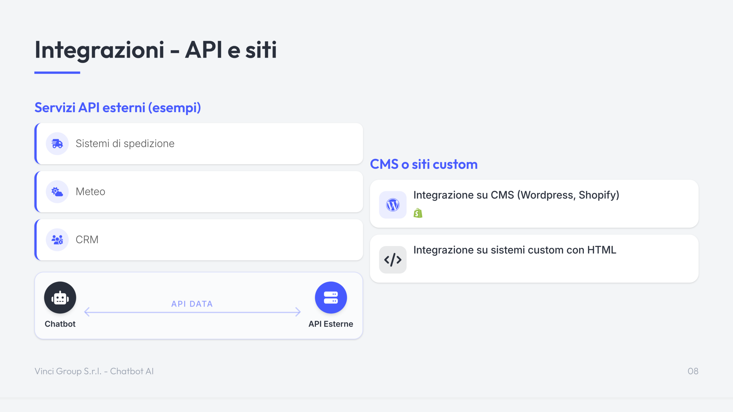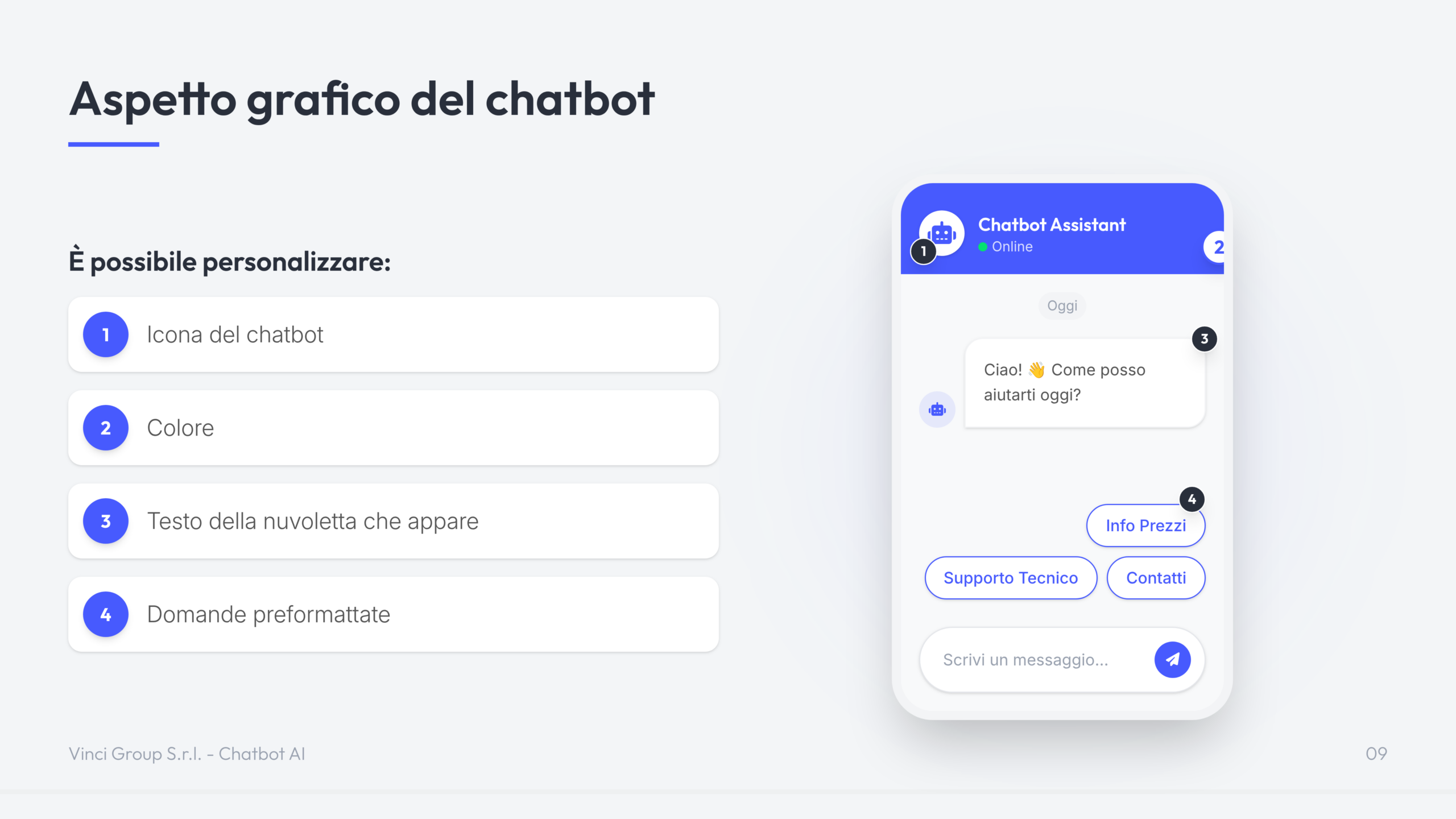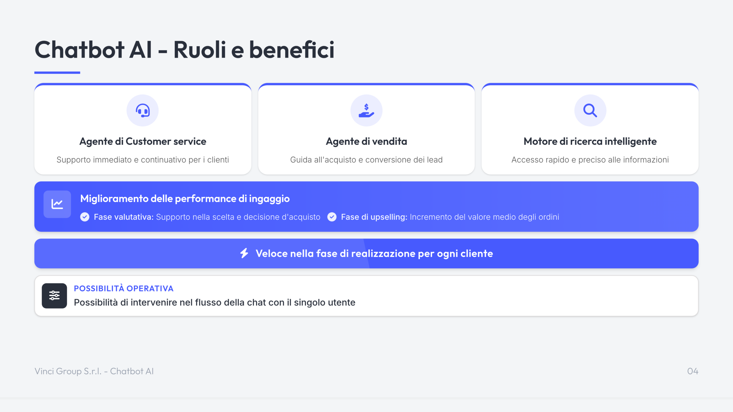 Il Chatbot AI di Vinci Group è una soluzione di intelligenza artificiale conversazionale progettata per automatizzare il supporto clienti e la gestione delle richieste su siti web ed e-commerce.